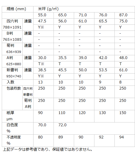 白色度75%程度以上。汎用性に富み、書籍、教科書、ポスター、商業印刷、一般印刷などに使用されます。